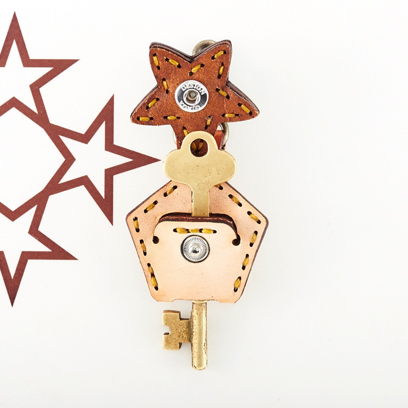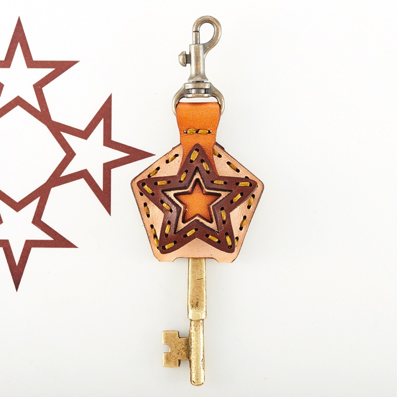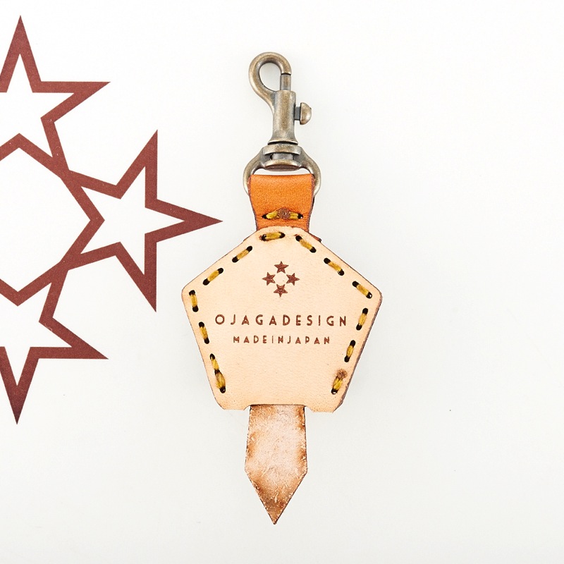 「オジャガデザイン」のロゴマークである五芒星がデザインされたフラップキーキャップです。ベースの五角形の上に、3枚の革の五芒星が組合わさった立体感のある仕上がりになっています。