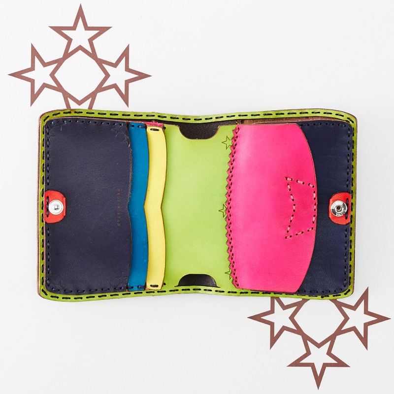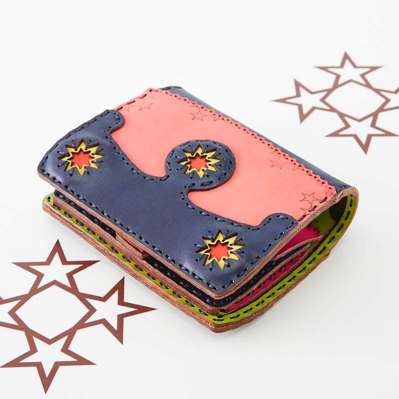 柔らかなディティールに施されたステッチワークが秀逸なショートウォレットです。八芒星のアクセントとモダンな形を組み合わせたデザインで、本アイテムのコインポケットは内側にあるため、「ANTLIA」よりもコンパクトな印象に。オジャガデザインらしいカラフルなアイテムを取り揃えました。※商品のDカンはオプションで取り付け可能です。