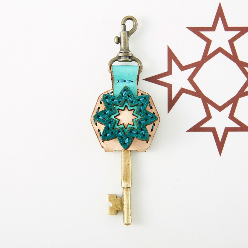 CANDYコレクションからピンクとスカイブルーの2色展開のアイテムが登場。スエードを使用し、革の質感の差をお楽しみ頂けるデザインです。3枚のレザーを重ねて八芒星がデザインされたキーキャップです。重なったフラップ部分のレザーが、バランス良く配色されて花のようなイメージとなっています。鮮やかな革パーツとカラフルなステッチが可愛らしいアイテムです。