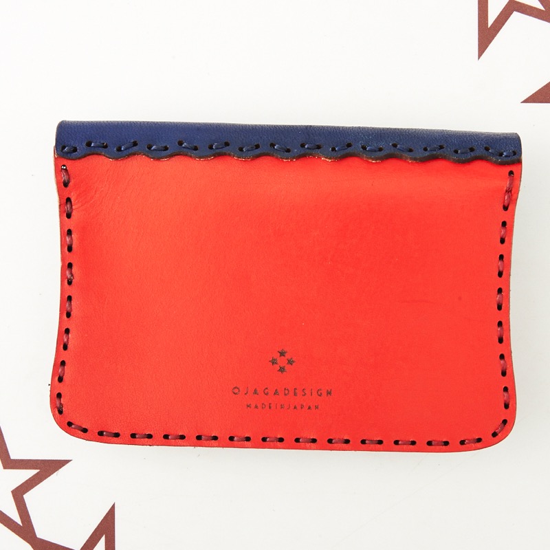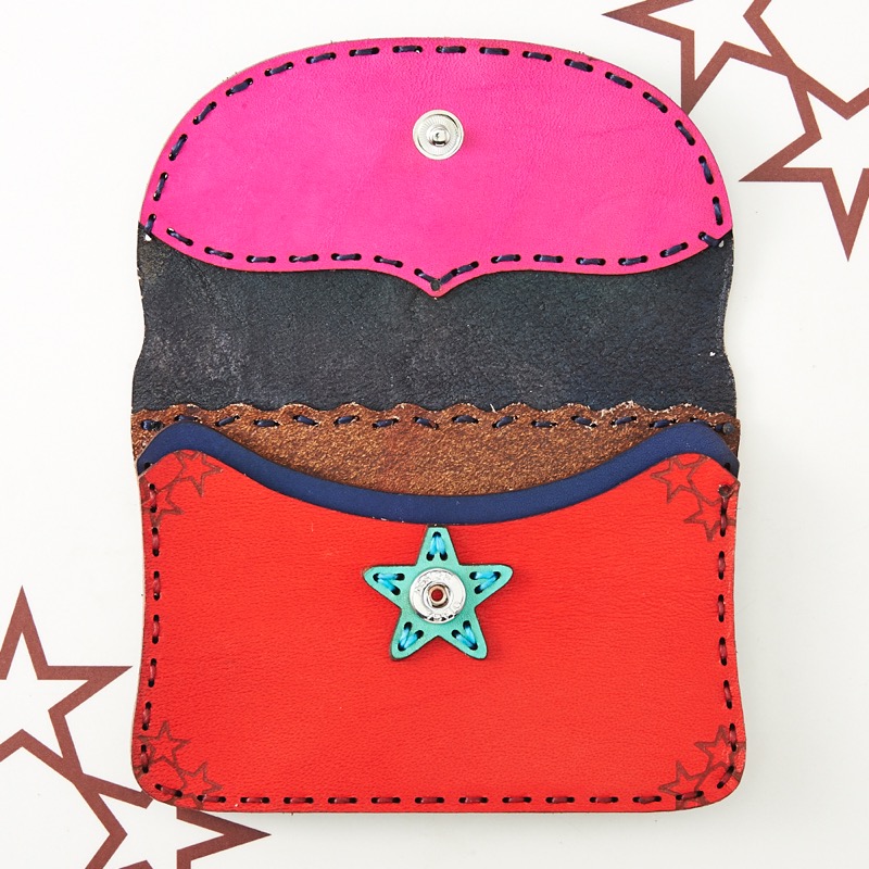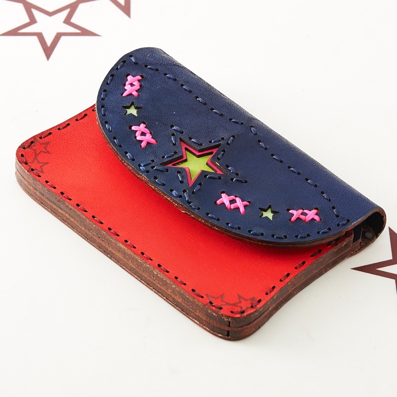 名刺入れとしてもお使い頂けるカードケースです。新色のキャメルレザーを使用し、独特の風合いを楽しめるアイテムとなりました。レザーの重なりがポイントの五芒星とクロスステッチをあしらい、他にはないデザインに。ボタン部分の五芒星もポイントです。