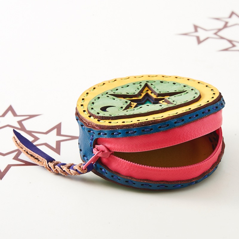 丸いフォルムが印象的な立体感のあるコインケースに、新しいデザインが登場しました。4層のレザーパーツで表現した大きな星の隣に、小さく主張する月がポイントです。ファスナー部分には編み込みされたレザーが付属されているため、使いやすい仕上がりとなりました。コインケースだけでなくミニポーチとしてもお使い頂けます。