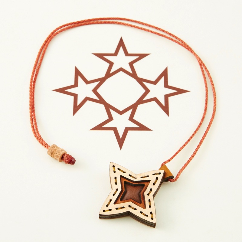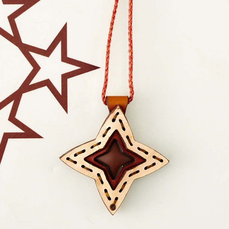 四芒星をデザインしたネックレスです。三枚の革を重ねた存在感のある仕上がりは、ファッションのアクセントに最適です。表裏それぞれ異なったカラーリングなので、リバーシブルでお楽しみ頂けます。紐部分のレザービーズで紐をお好みの長さに調整出来る仕様となっております。