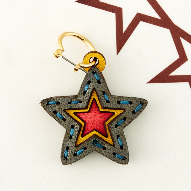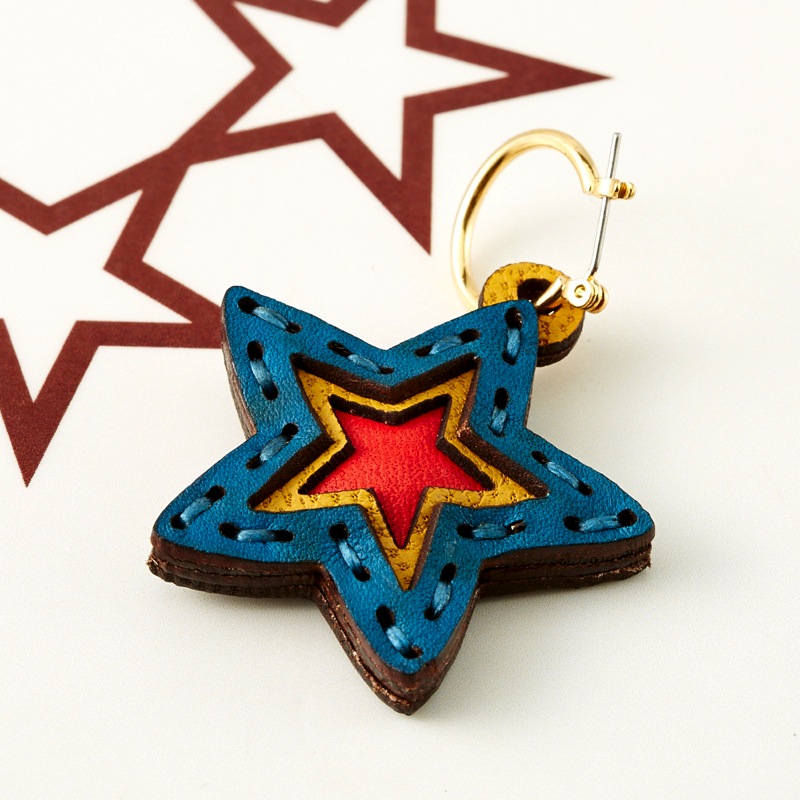 五芒星型の片耳用ピアスです。三枚の革を重ねた存在感のある仕上がりは、ファッションのアクセントに最適です。表裏それぞれ異なったカラーリングなので、リバーシブルでお楽しみ頂けます。片耳用なので、左右違ったデザインでのコーディネートもおすすめです。