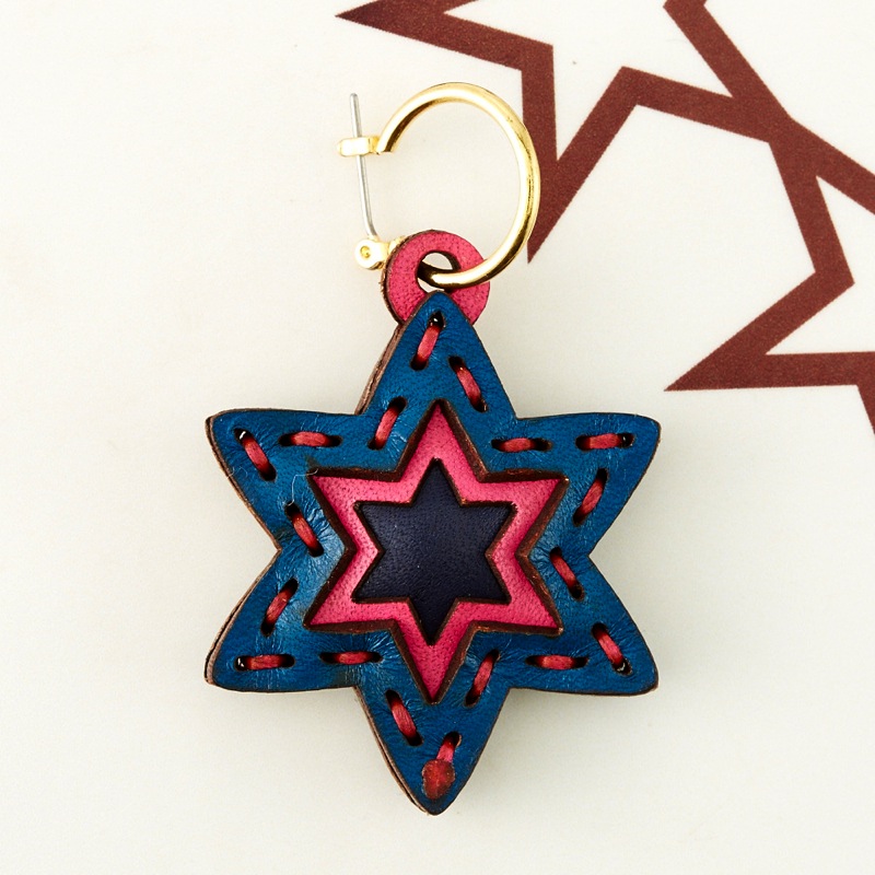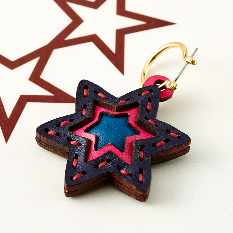 六芒星型の片耳用ピアスです。三枚の革を重ねた存在感のある仕上がりは、ファッションのアクセントに最適です。表裏それぞれ異なったカラーリングなので、リバーシブルでお楽しみ頂けます。片耳用なので、左右違ったデザインでのコーディネートもおすすめです。
