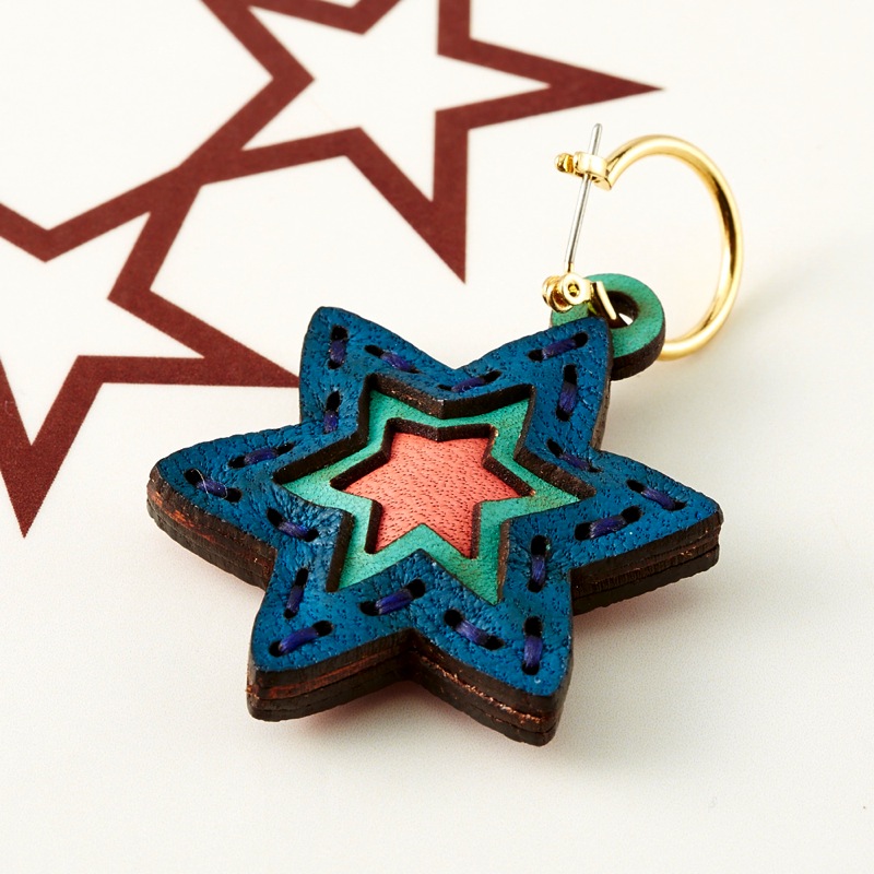 六芒星型の片耳用ピアスです。三枚の革を重ねた存在感のある仕上がりは、ファッションのアクセントに最適です。表裏それぞれ異なったカラーリングなので、リバーシブルでお楽しみ頂けます。片耳用なので、左右違ったデザインでのコーディネートもおすすめです。