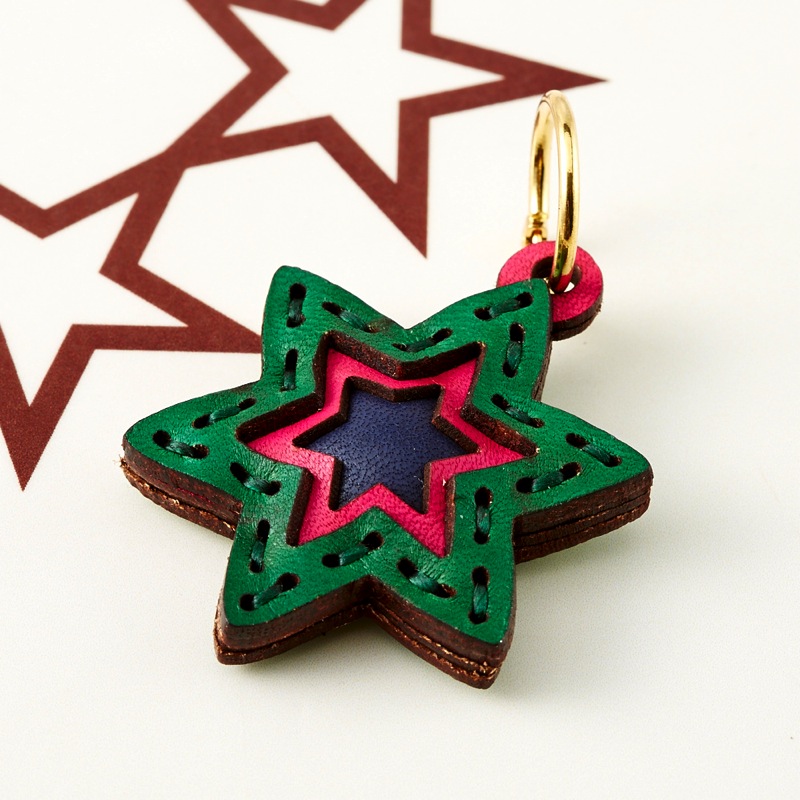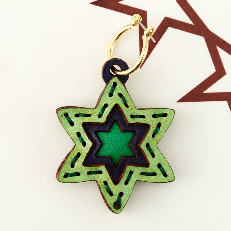 六芒星型の片耳用ピアスです。三枚の革を重ねた存在感のある仕上がりは、ファッションのアクセントに最適です。表裏それぞれ異なったカラーリングなので、リバーシブルでお楽しみ頂けます。片耳用なので、左右違ったデザインでのコーディネートもおすすめです。