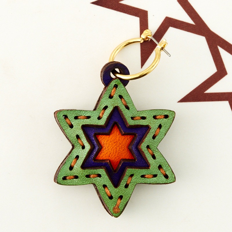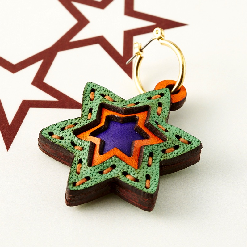 六芒星型の片耳用ピアスです。三枚の革を重ねた存在感のある仕上がりは、ファッションのアクセントに最適です。表裏それぞれ異なったカラーリングなので、リバーシブルでお楽しみ頂けます。片耳用なので、左右違ったデザインでのコーディネートもおすすめです。
