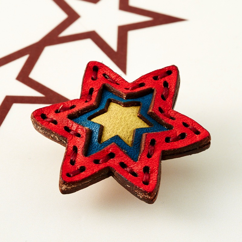 六芒星型の片耳用イヤリングです。三枚の革を重ねた存在感のある仕上がりは、ファッションのアクセントに最適です。耳が痛くなりにくいクリップタイプの金具を使用しております。片耳用なので、左右違ったデザインでのコーディネートもおすすめです。