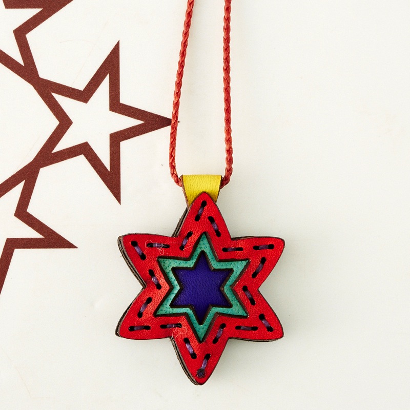 六芒星をデザインしたネックレスです。三枚の革を重ねた存在感のある仕上がりは、ファッションのアクセントに最適です。表裏それぞれ異なったカラーリングなので、リバーシブルでお楽しみ頂けます。紐部分のレザービーズで紐をお好みの長さに調整出来る仕様となっております。