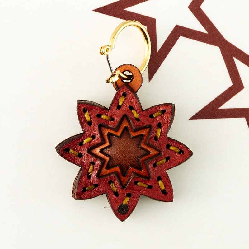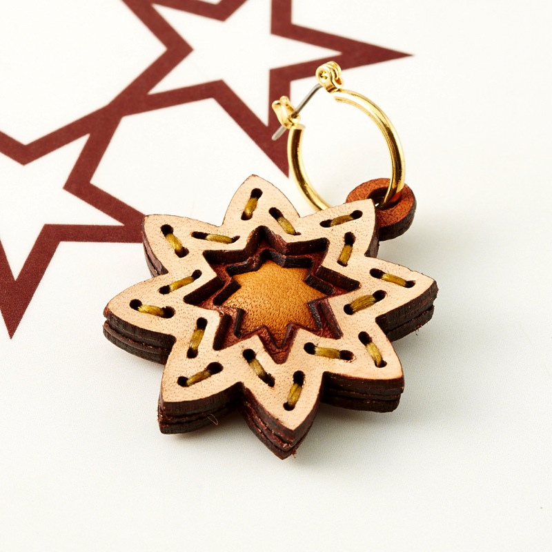 八芒星型の片耳用ピアスです。三枚の革を重ねた存在感のある仕上がりは、ファッションのアクセントに最適です。表裏それぞれ異なったカラーリングなので、リバーシブルでお楽しみ頂けます。片耳用なので、左右違ったデザインでのコーディネートもおすすめです。