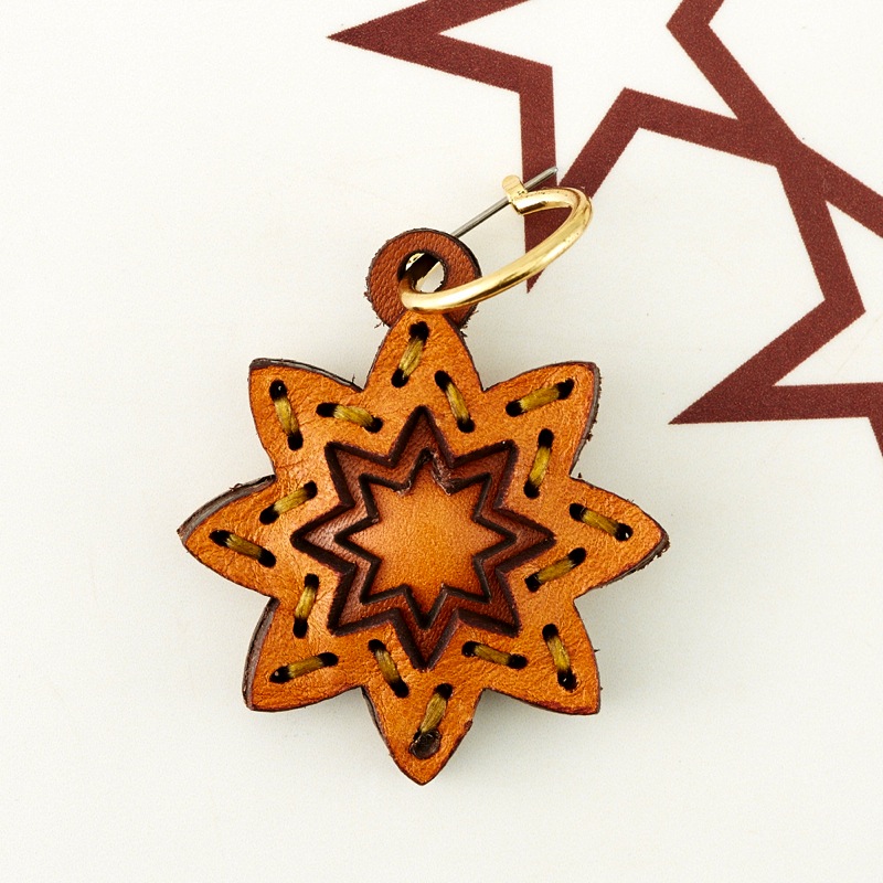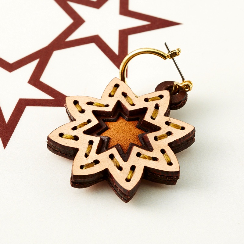 八芒星型の片耳用ピアスです。三枚の革を重ねた存在感のある仕上がりは、ファッションのアクセントに最適です。表裏それぞれ異なったカラーリングなので、リバーシブルでお楽しみ頂けます。片耳用なので、左右違ったデザインでのコーディネートもおすすめです。