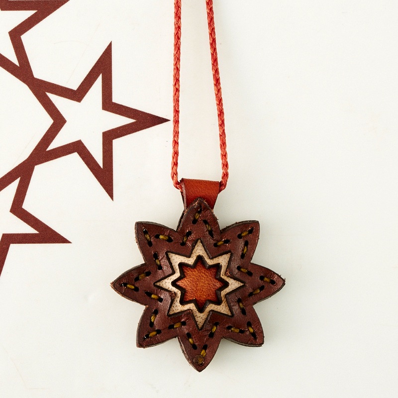 八芒星をデザインしたネックレスです。三枚の革を重ねた存在感のある仕上がりは、ファッションのアクセントに最適です。表裏それぞれ異なったカラーリングなので、リバーシブルでお楽しみ頂けます。紐部分のレザービーズで紐をお好みの長さに調整出来る仕様となっております。