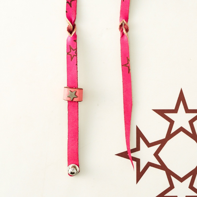 発色の良いレザーにオジャガスターの焼き印を施し、さりげない星スタッズがワンポイントになった二重巻きタイプのブレスレット。シンプルでファッションに取り入れやすく、飽きのこないデザインに仕上がりました。豊富なカラーを取り揃えておりますので、デザイン違いの重ね着けや、違った色で2色着けなど、色々なコーディネートをお楽しみ下さい。
