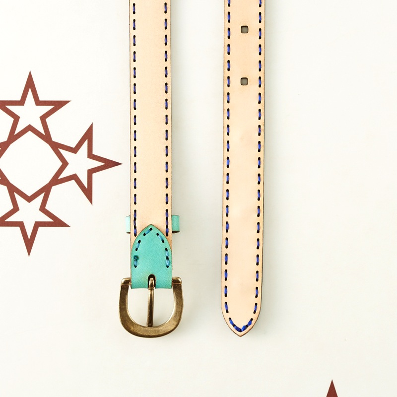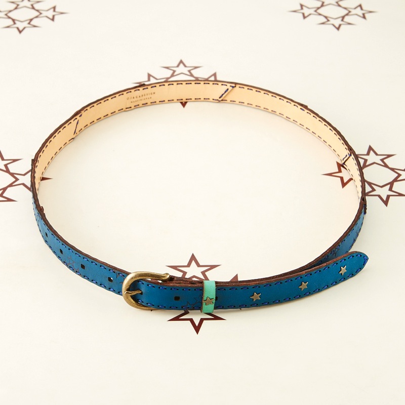 発色の良いレザーにオジャガスターの焼き印を施し、さりげない星スタッズがワンポイントになったベルトです。