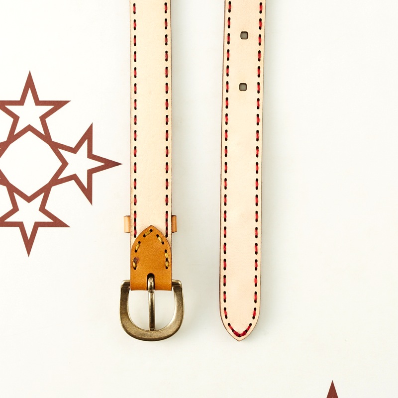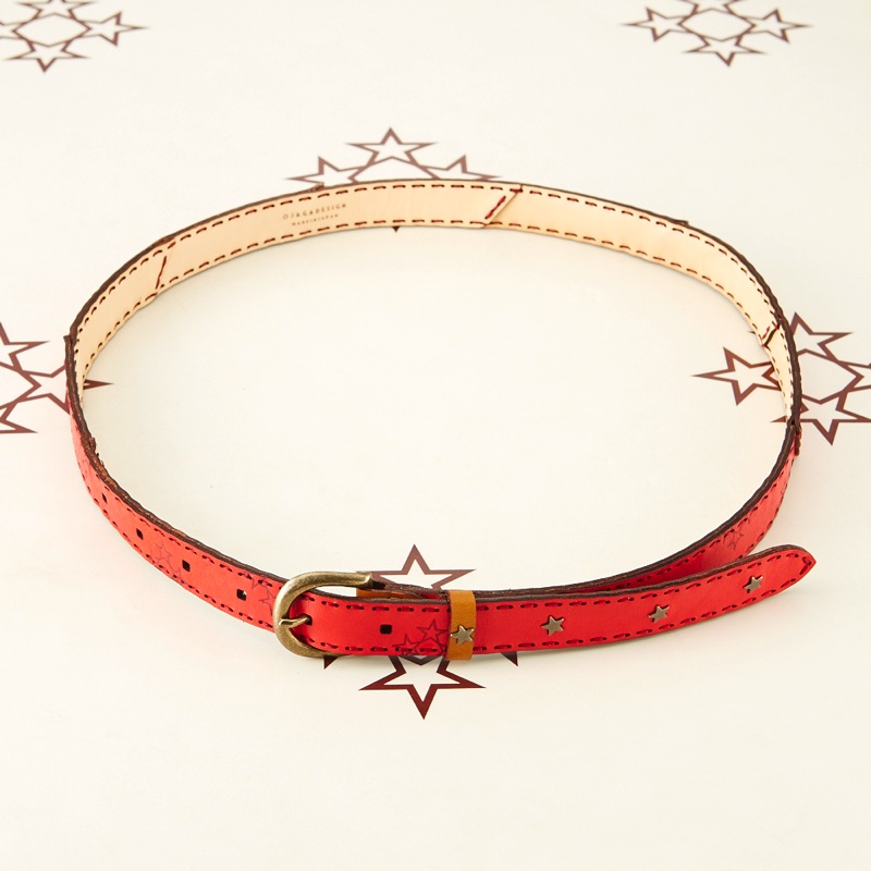 発色の良いレザーにオジャガスターの焼き印を施し、さりげない星スタッズがワンポイントになったベルトです。