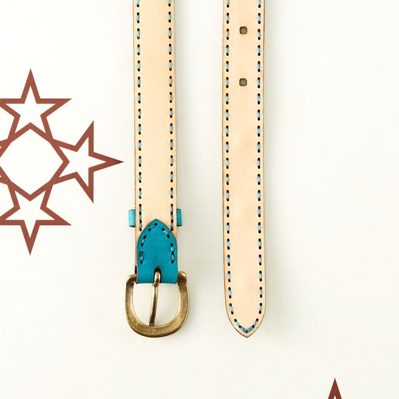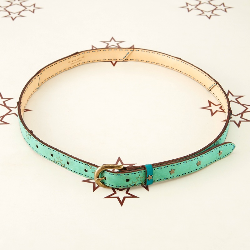 発色の良いレザーにオジャガスターの焼き印を施し、さりげない星スタッズがワンポイントになったベルトです。