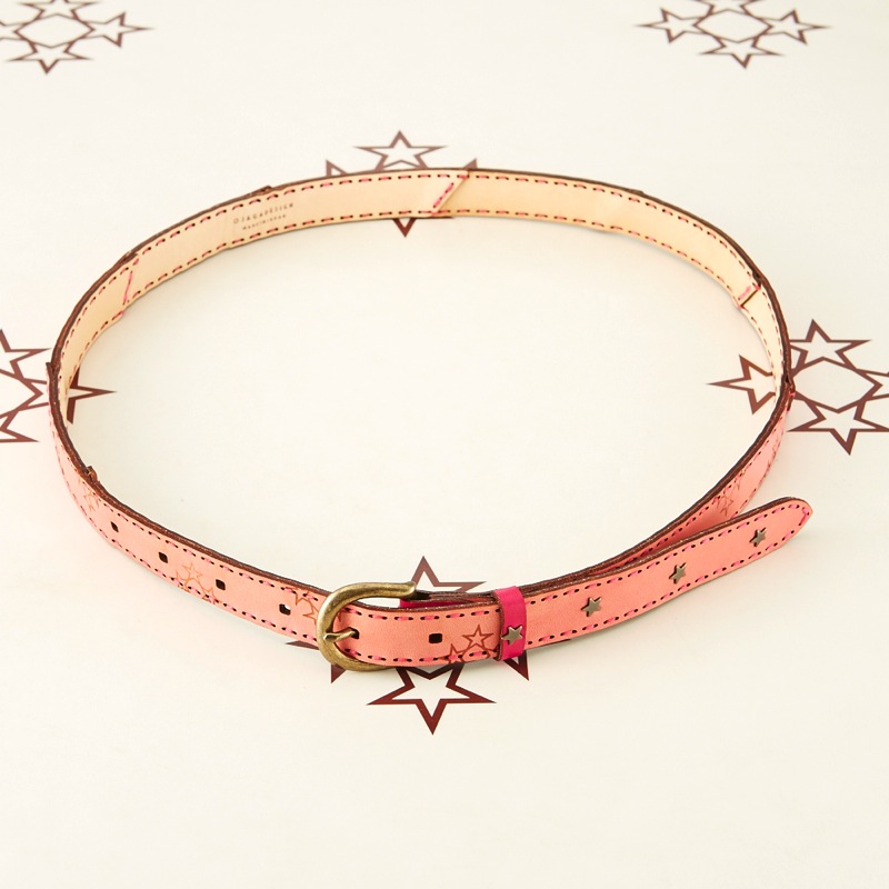 発色の良いレザーにオジャガスターの焼き印を施し、さりげない星スタッズがワンポイントになったベルトです。