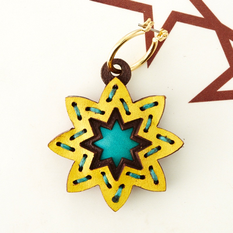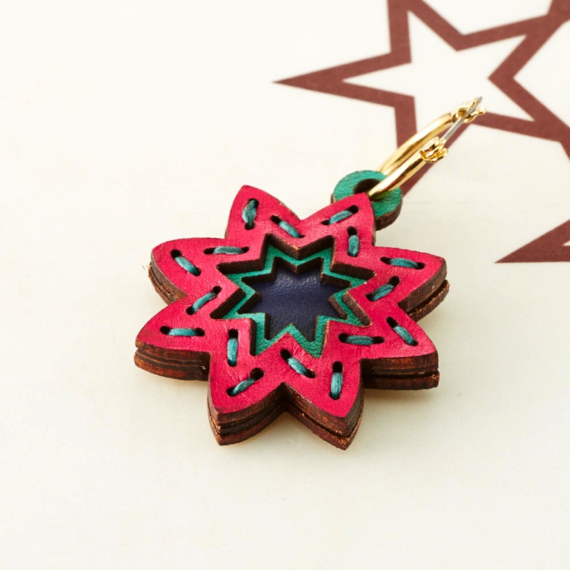 八芒星型の片耳用ピアスです。三枚の革を重ねた存在感のある仕上がりは、ファッションのアクセントに最適です。表裏それぞれ異なったカラーリングなので、リバーシブルでお楽しみ頂けます。片耳用なので、左右違ったデザインでのコーディネートもおすすめです。