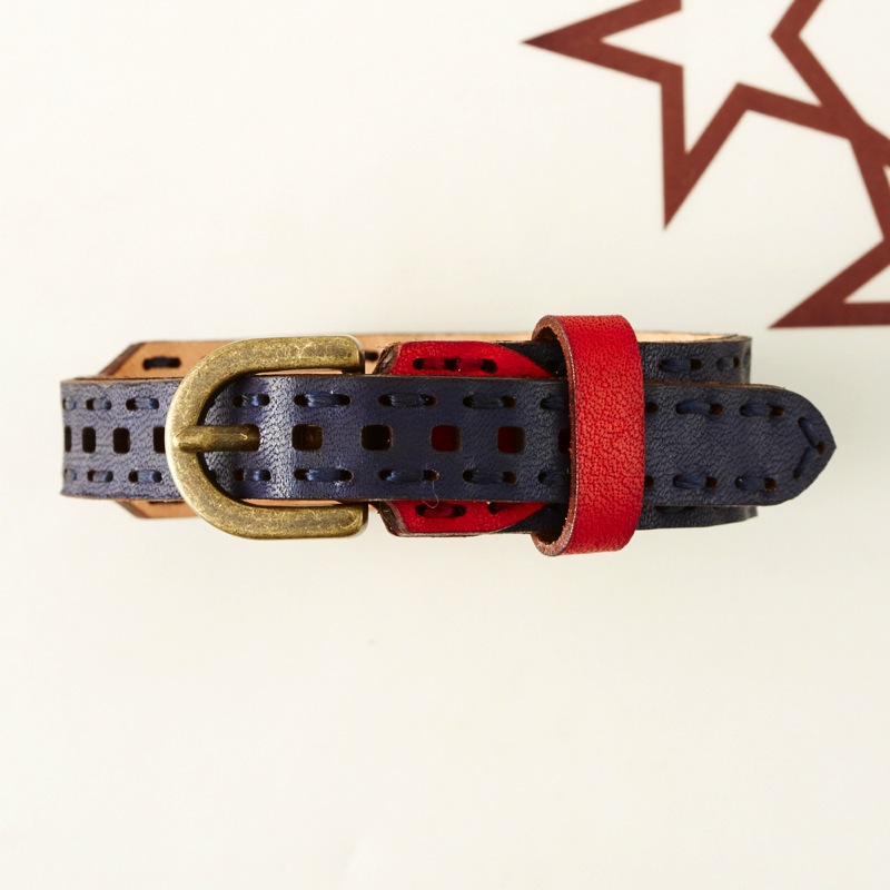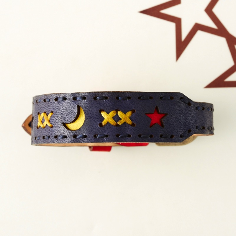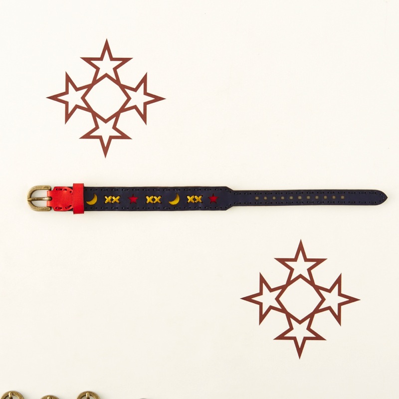 月と星のデザインの間にはクロスステッチを施したブレスレットです。腕周りのアクセントにおすすめな、可愛らしい仕上がりとなりました。カラーバリエーションが豊富なので、その日の気分やコーディネートで色を変えてみるのも楽しいアイテムです。サイズ調節が簡単にできるベルトタイプとなっておりますので、男女問わずお使い頂けます。