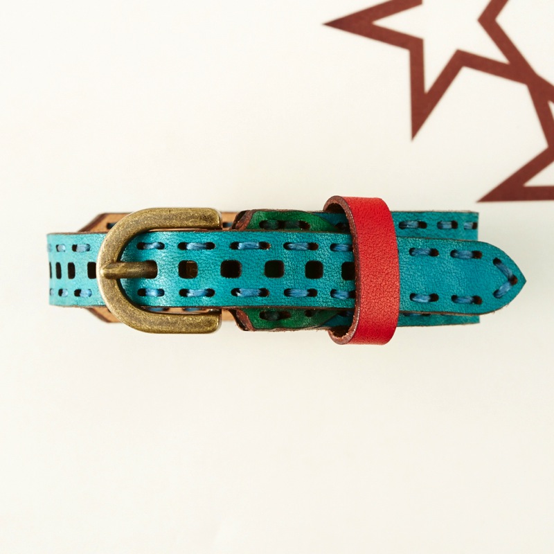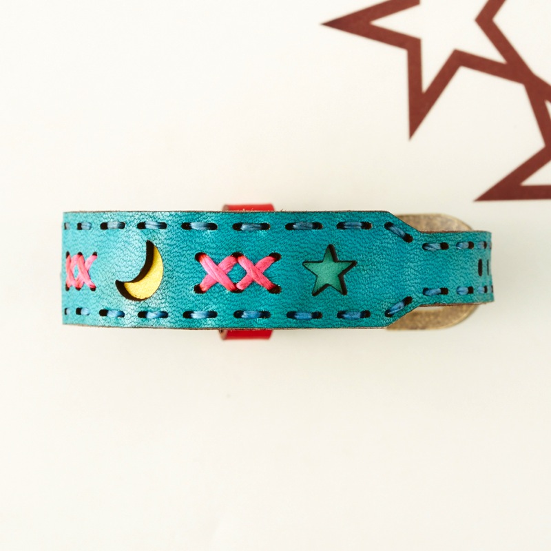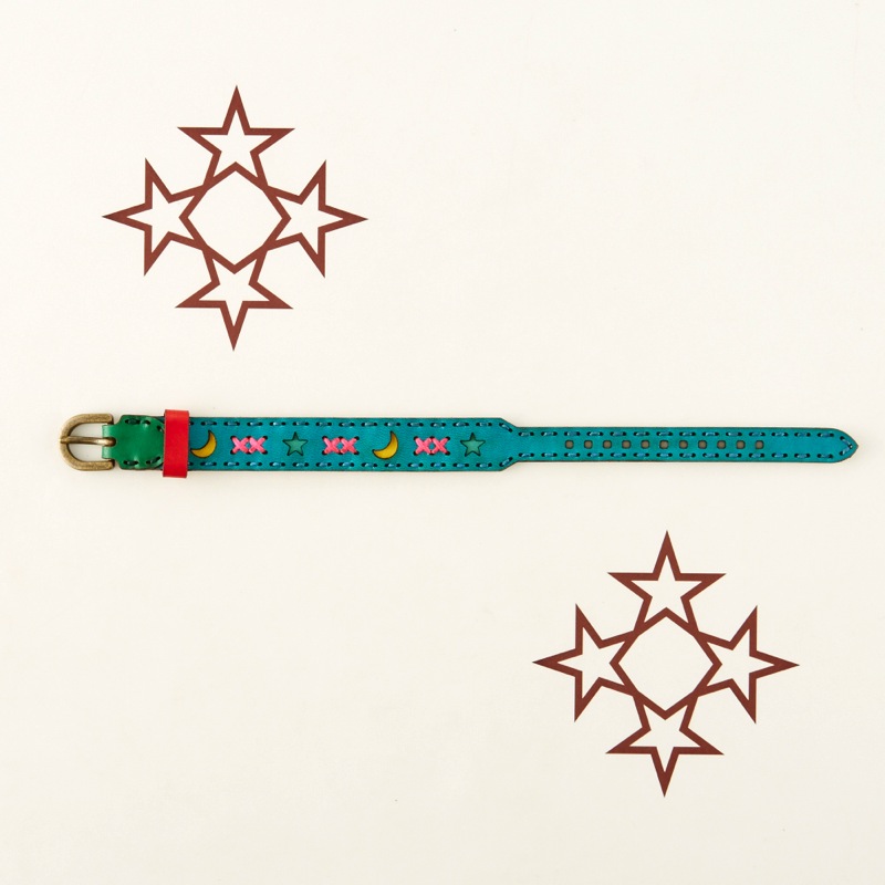 月と星のデザインの間にはクロスステッチを施したブレスレットです。腕周りのアクセントにおすすめな、可愛らしい仕上がりとなりました。カラーバリエーションが豊富なので、その日の気分やコーディネートで色を変えてみるのも楽しいアイテムです。サイズ調節が簡単にできるベルトタイプとなっておりますので、男女問わずお使い頂けます。