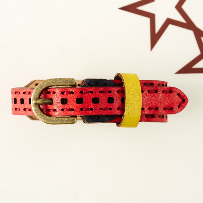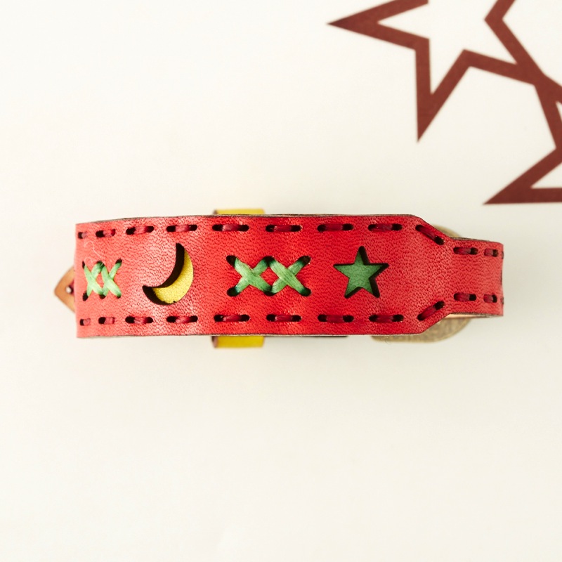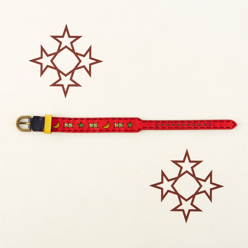 月と星のデザインの間にはクロスステッチを施したブレスレットです。腕周りのアクセントにおすすめな、可愛らしい仕上がりとなりました。カラーバリエーションが豊富なので、その日の気分やコーディネートで色を変えてみるのも楽しいアイテムです。サイズ調節が簡単にできるベルトタイプとなっておりますので、男女問わずお使い頂けます。
