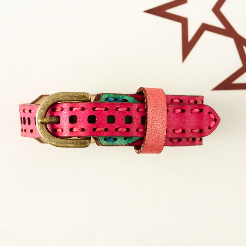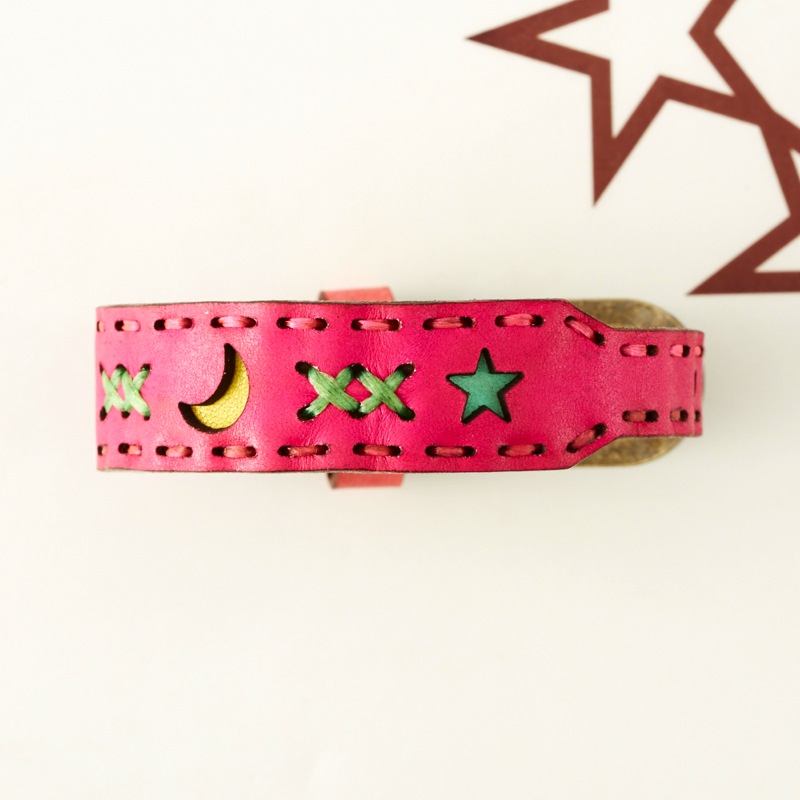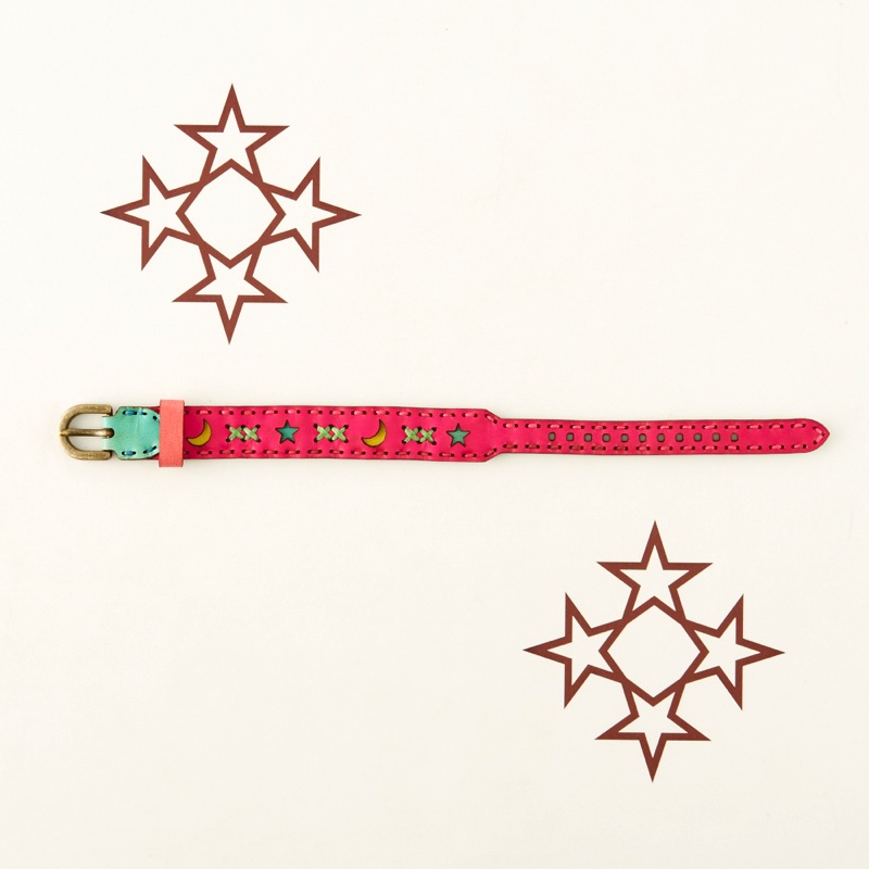 月と星のデザインの間にはクロスステッチを施したブレスレットです。腕周りのアクセントにおすすめな、可愛らしい仕上がりとなりました。カラーバリエーションが豊富なので、その日の気分やコーディネートで色を変えてみるのも楽しいアイテムです。サイズ調節が簡単にできるベルトタイプとなっておりますので、男女問わずお使い頂けます。